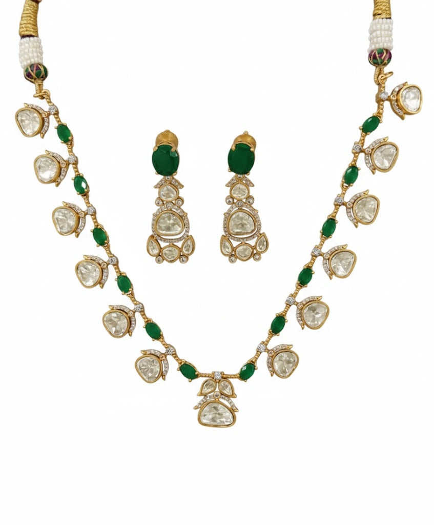 An exquisite, handcrafted jewelry set featuring traditional uncut Polki diamonds and Kundan work. Choose from classic chokers, elegant pendant sets, or intricate designs accented with gemstones like emeralds. Each piece reflects time-honored Indian craftsmanship, perfect for grand festive and bridal occasions.