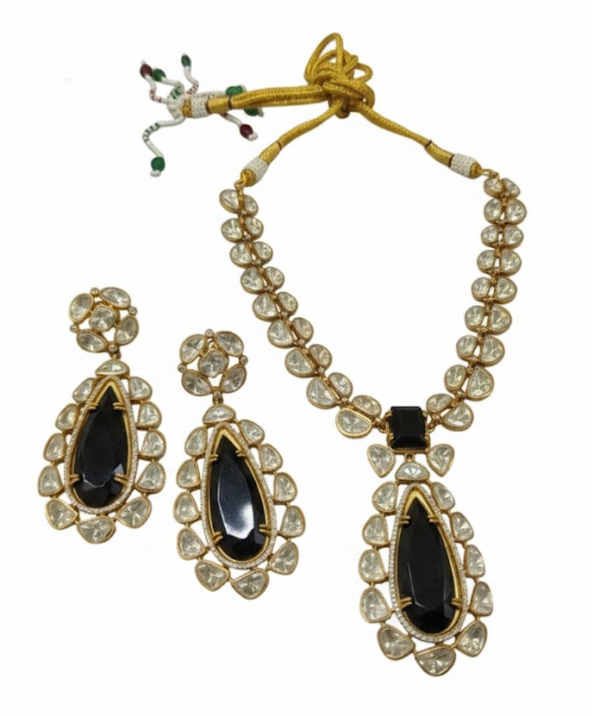 | A stunning gold-plated necklace set featuring a captivating teardrop-shaped black Mossinate stone pendant and matching earrings. The stones are elegantly framed by sparkling white Mossinate gems on a delicate leaf-design chain, perfect for a sophisticated, modern look. |