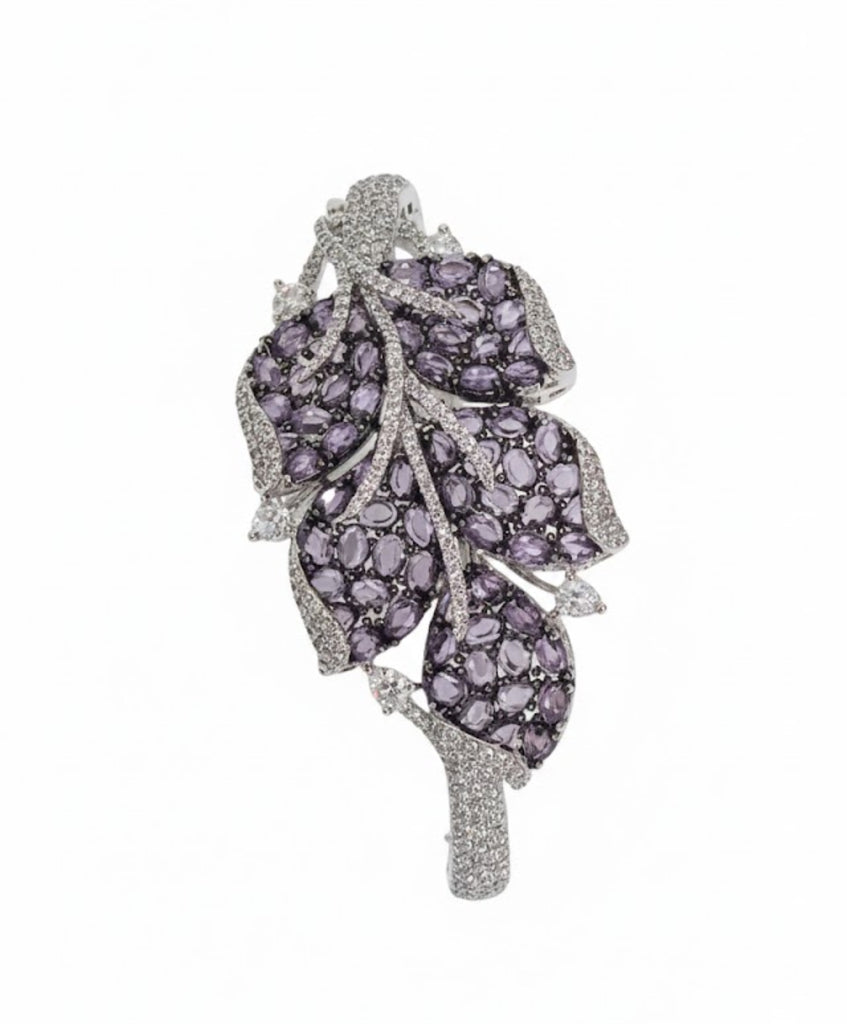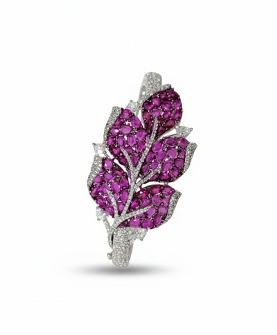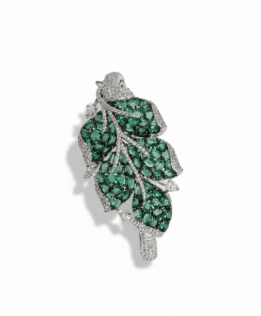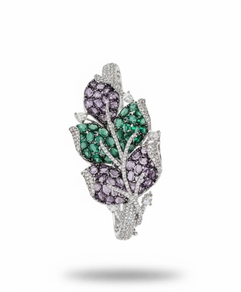 An exquisite, rhodium-plated leaf bracelet adorned with sparkling micro-pave cubic zirconia and richly colored oval-cut accent stones. This elegant, nature-inspired accessory is a perfect statement piece for any attire