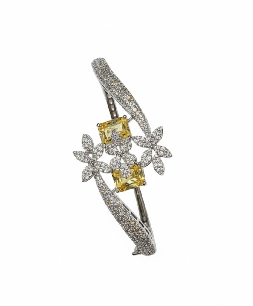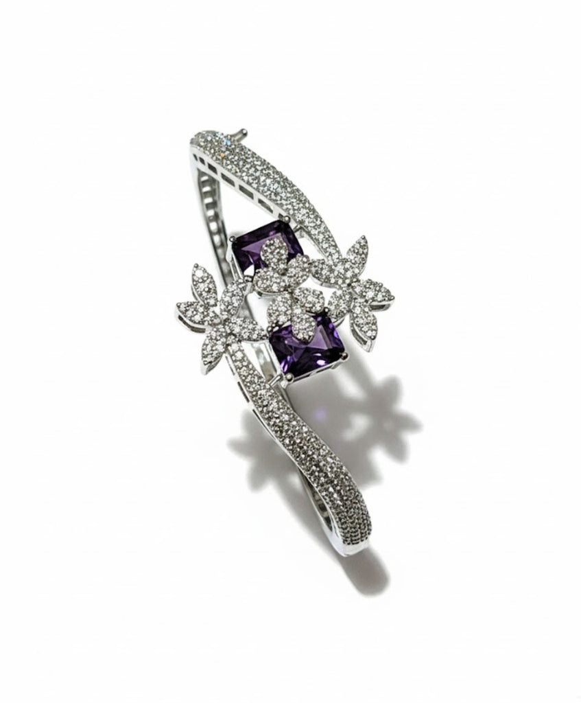 An elegant, rhodium-plated cuff bracelet featuring a striking central display of two rectangular, vibrant gemstones (available in Dazzling Canary or Mystic Amethyst), embraced by sparkling floral motifs. The split band is intricately paved with brilliant cubic zirconia, creating a breathtaking, sweeping design. This versatile piece effortlessly adds a touch of glamour and celestial charm to any ensemble