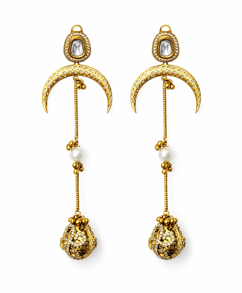 Elegant gold-finish statement earrings featuring a sparkling crystal stud, intricately carved crescent motif, delicate chain detailing, and a graceful pearl accent. Finished with an ornate filigree drop, this design blends traditional charm with modern sophistication — perfect for festive and wedding occasions.