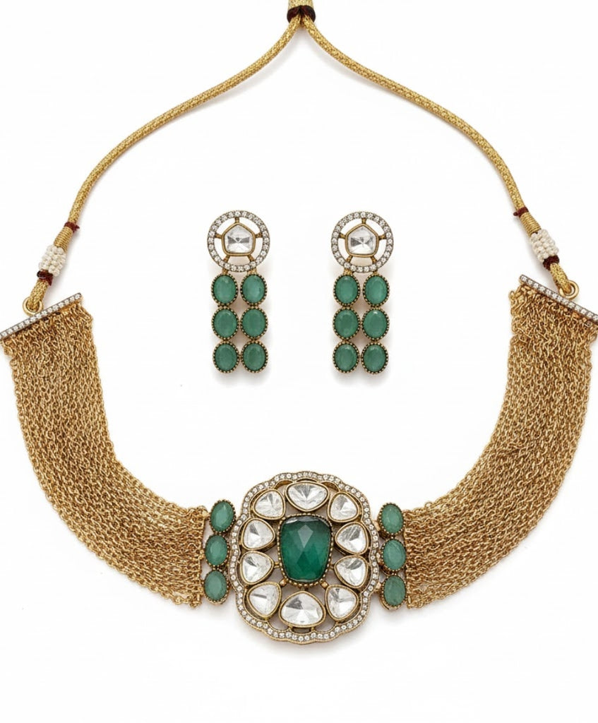 This striking jewelry set features a multi-layered gold-finish mesh chain that elegantly contours the neck, leading to a magnificent circular centerpiece. The pendant is meticulously crafted with a large raw emerald stone at its heart, surrounded by a radiant halo of shimmering Polki stones and finished with delicate green bead accents. Paired with matching geometric drop earrings featuring tiered green stones, this set offers a perfect blend of bold contemporary design and traditional royal charm