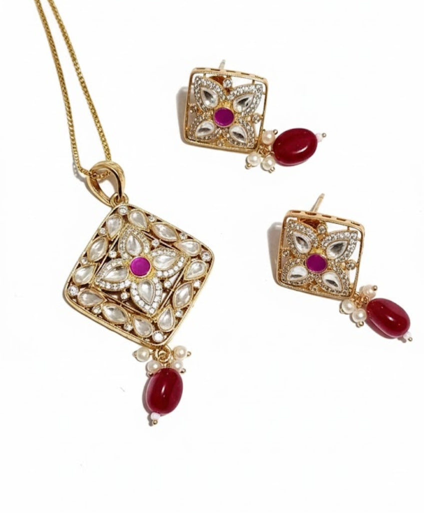 An elegant gold-tone pendant and earring set featuring a chic square, diamond-shaped design. The pieces are beautifully adorned with brilliant Polki-style uncut stones surrounding a central fuchsia/magenta ruby accent. Each piece is finished with a charming dangle featuring a deep red teardrop bead and small faux pearls. This versatile set offers a modern take on traditional Indian jewelry, perfect for everyday sophistication or festive events.