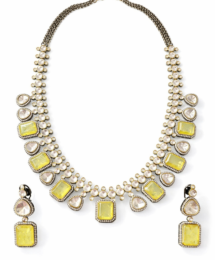 A luxurious statement necklace set featuring radiant citrine-hued rectangular stones paired with elegant teardrop crystals, beautifully framed in intricate detailing. Designed to add royal charm and timeless sophistication to weddings, festive occasions, and grand celebrations.