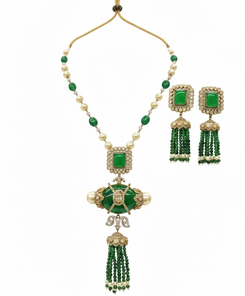 | A magnificent long necklace featuring a central, ornate emerald-green Real Mossinate stone pendant, accented with surrounding pearls and dazzling white gems. It is paired with rectangular stud earrings that have elaborate green beaded tassels, creating a royal and sophisticated statement look. |