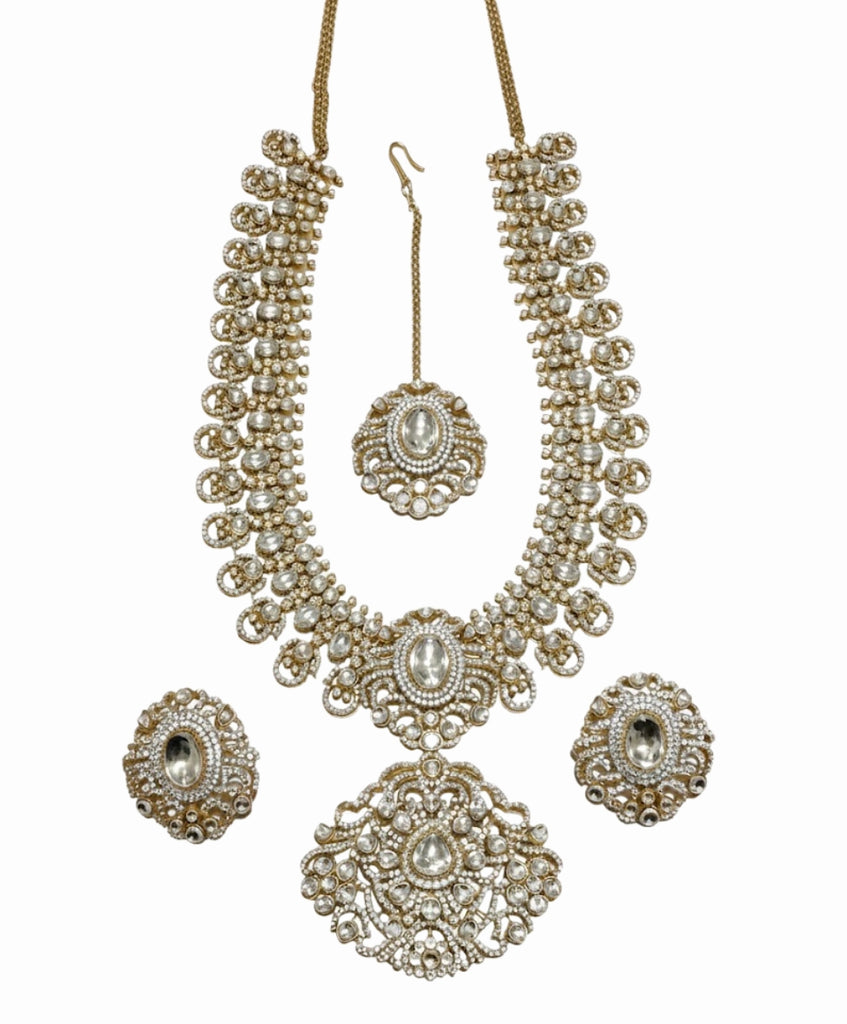 A breathtaking, fully crystallized bridal ensemble. This magnificent gold-tone set features an intricate, heavily embellished horseshoe-style choker necklace, accompanied by an oversized pendant, matching stud earrings, and a dainty maang tikka. Adorned entirely with sparkling Polki and American diamonds, this traditional set delivers maximum glamour and shine, making it the perfect choice for the main wedding event.