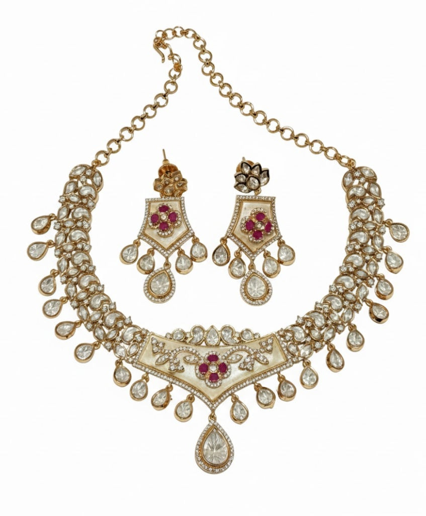 A fusion of modern design and classic artistry. This elegant choker set features a striking central pendant and matching drop earrings, beautifully highlighted with smooth Ivory Meenakari work. The pieces are studded with dazzling crystals and accented by deep ruby-red floral motifs, finished with sparkling diamond-look drops. This versatile set is perfect for contemporary festive wear or wedding guest attire.