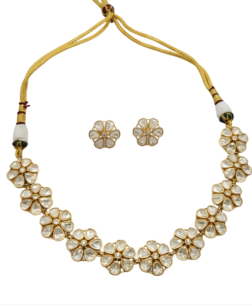 | An elegant gold-plated choker and stud earring set featuring a continuous row of delicate Real Mossinate stones set in beautiful floral cluster motifs. This lightweight and classic design offers a subtle yet dazzling traditional charm, perfect for daily wear or light events. |