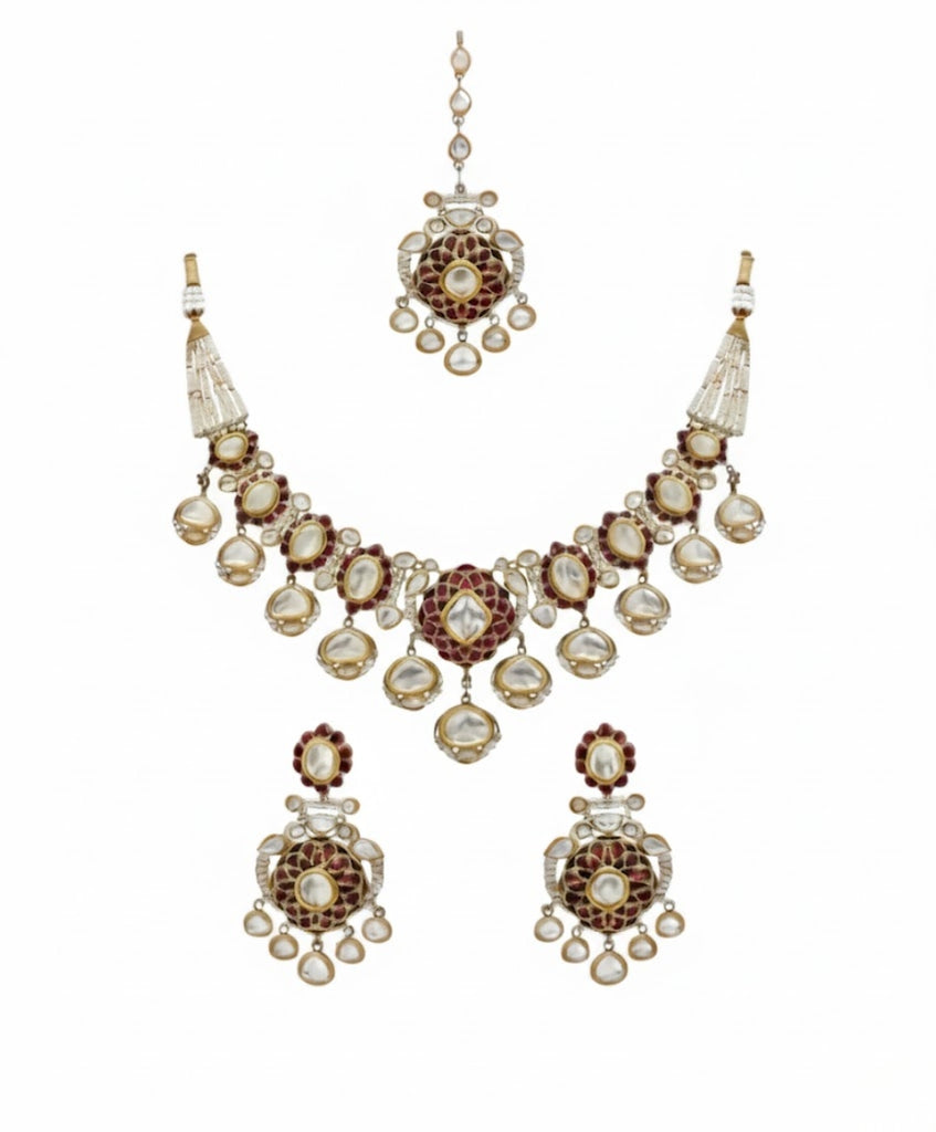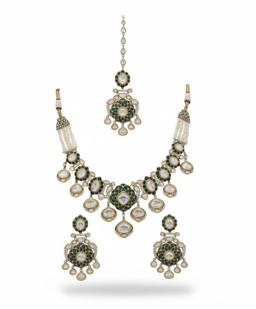 A charming gold-plated double-strand necklace featuring two layers of delicate, teardrop-shaped motifs with small Mossinate stones set in a leaf/mango design. The set is completed with matching tiered drop earrings, creating an elegant, flowing, and traditional look.