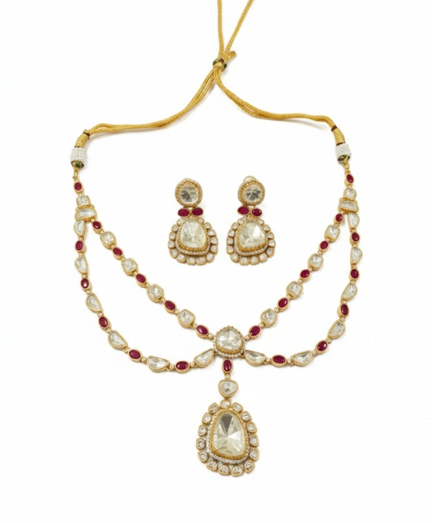 A sophisticated gold-tone flexible choker and matching earring set featuring large, brilliant Real Mossinate stones (Kundan style) set in ornate square and petal motifs, beautifully framed by micro white gems for a timeless, classic look.
