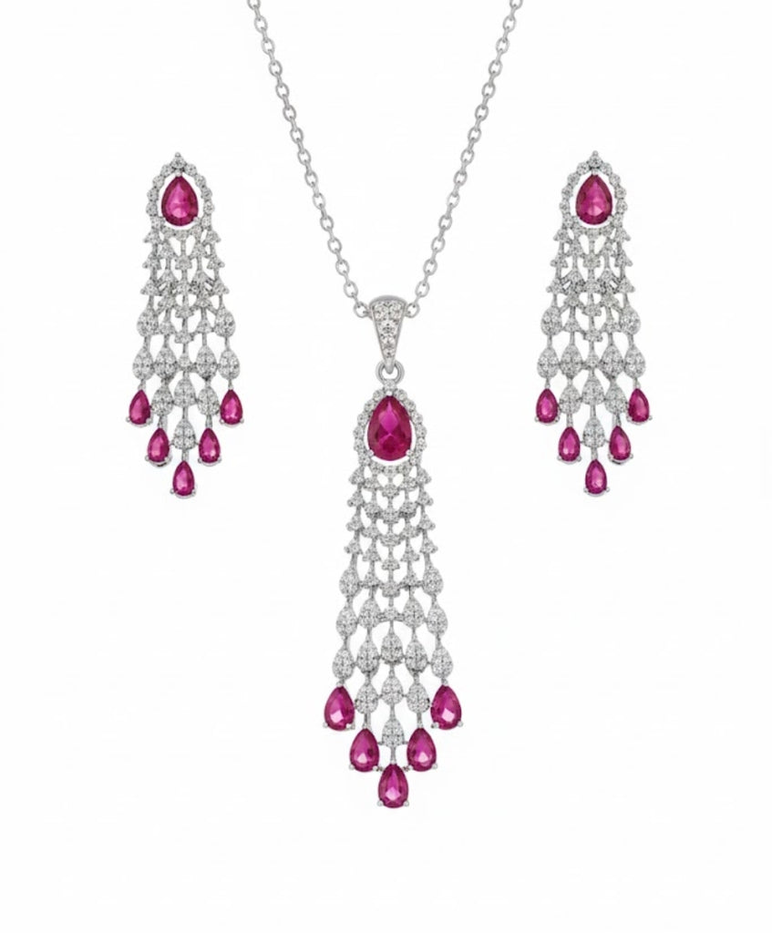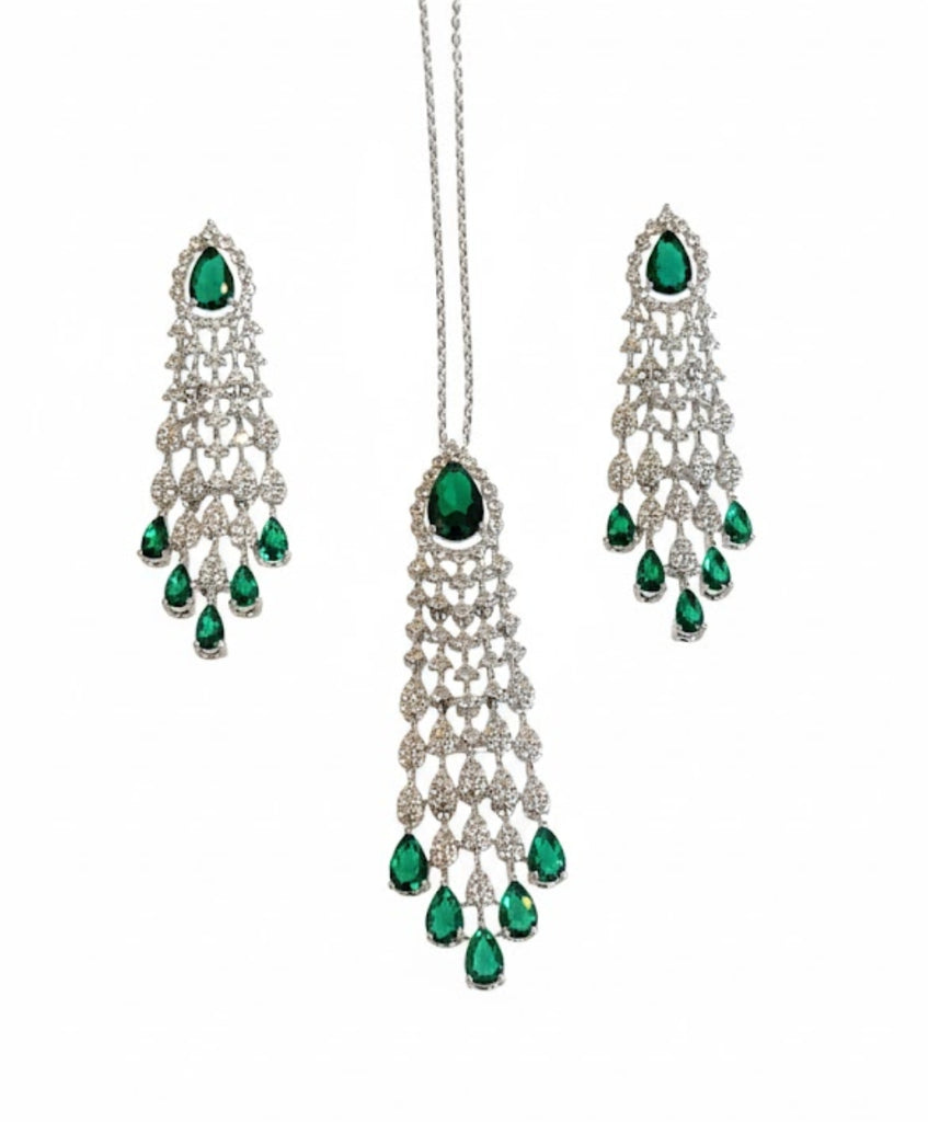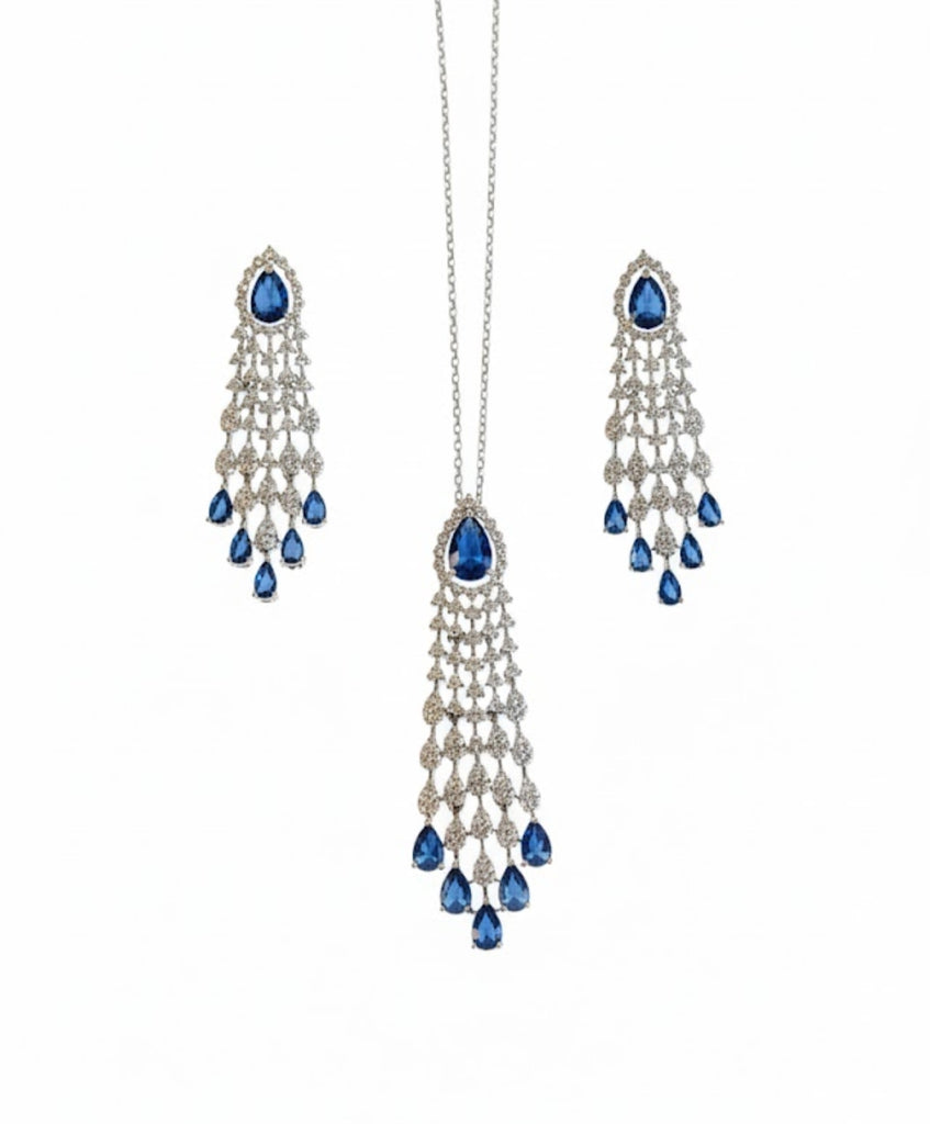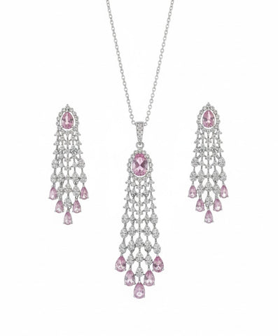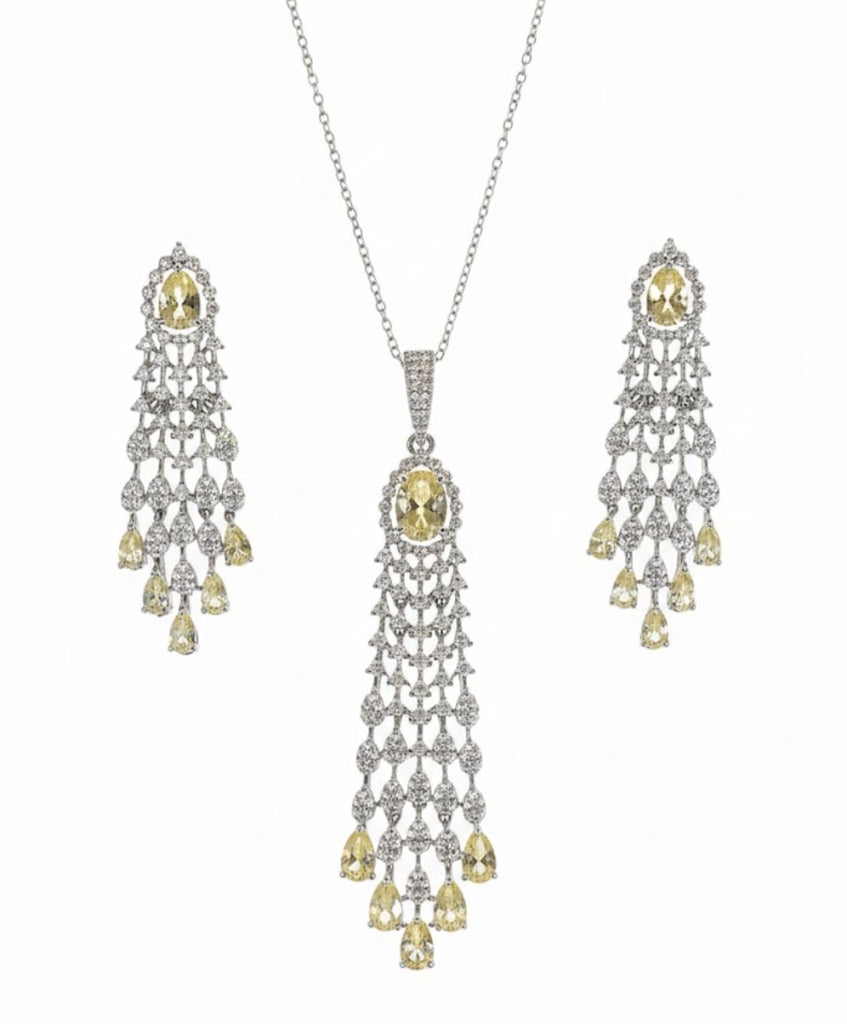 Elevate your evening elegance with this exquisite jewelry set, featuring a stunning pendant necklace and matching chandelier earrings. Designed with a sophisticated cascading lattice of brilliant white crystals and teardrop-cut gemstones, this set offers a regal silhouette and a timeless sparkle. Perfect for weddings, galas, and special occasions, it is a true statement of luxury and grace.