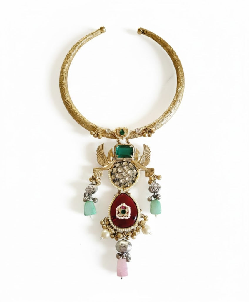 A regal and elaborate Antique Gold-Toned Choker Necklace featuring a meticulously textured neckpiece. The stunning pendant is a composition of traditional motifs, including stylized twin bird (hansuli) figures, a prominent Emerald-cut stone, and a large, deep Ruby-red Meenakari element detailed with Kundan accents. It is embellished with silver-toned drops, small pearls, and mint and pink gemstone drops. This artistic statement piece is perfect for grand ethnic occasions and showcases rich, Mughal-Rajput inspired craftsmanship.