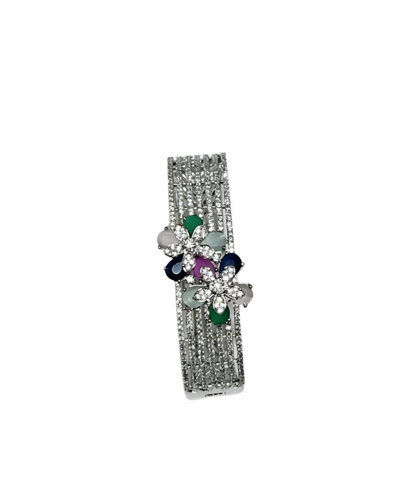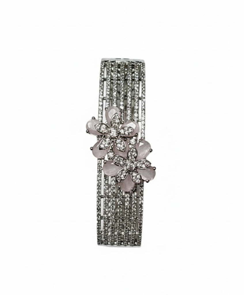 A visually captivating pairing of two statement cuff bracelets, both elegantly displayed against a clean, white background, emphasizing their contrasting yet luxurious appeal. This is a modern, wide silver-tone cuff featuring vertical rows of pavé-set white stones, centered by two delicate floral clusters adorned with blush pink/rose quartz marquise stones.
