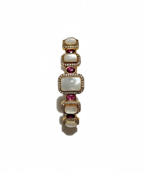 An elegant gold-toned bracelet featuring luminous, cushion-cut Mother of Pearl segments accented by sparkling pink or garnet-colored stones. A feminine and sophisticated piece, perfect for everyday grace or special occasions.