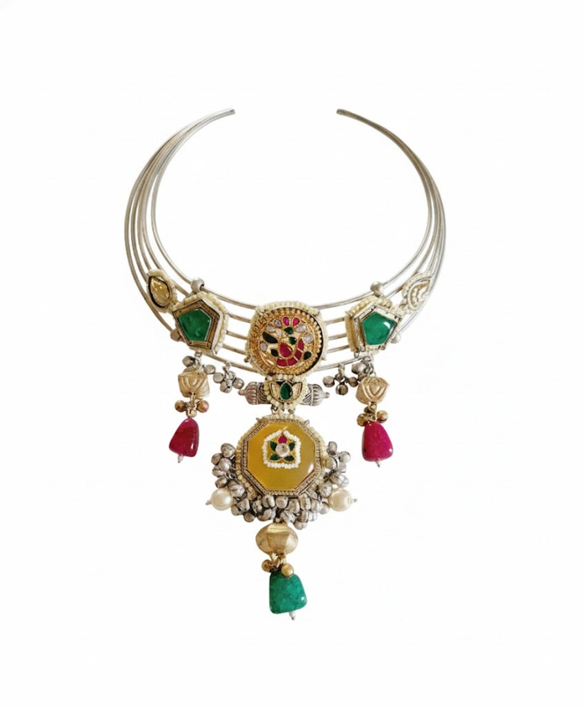 A breathtaking Multi-Strand Silver-Toned Open Choker that showcases exquisite traditional craftsmanship. The elaborate pendant features a dual-tone design with a large, octagonal Mustard-Yellow Meenakari centerpiece, accented by colorful stones (emerald green and ruby pink drops) and delicate pearl detailing. The unique multi-wire neckpiece, antique ghungroos, and vibrant elements give this piece a rich, Mughal-era feel. This luxurious statement necklace is an unforgettable accessory for destination weddings and grand festive occasions.