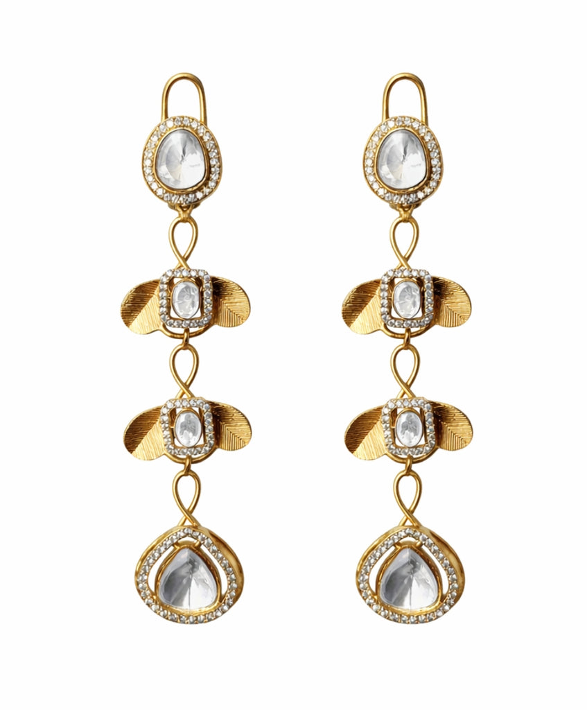 Elegant gold-tone long drop earrings featuring oval and pear-cut crystal stones, surrounded by delicate white stone halos. Intricate leaf-textured side detailing and fine craftsmanship give it a royal, graceful look — perfect for weddings, festive occasions, and premium party wear styling