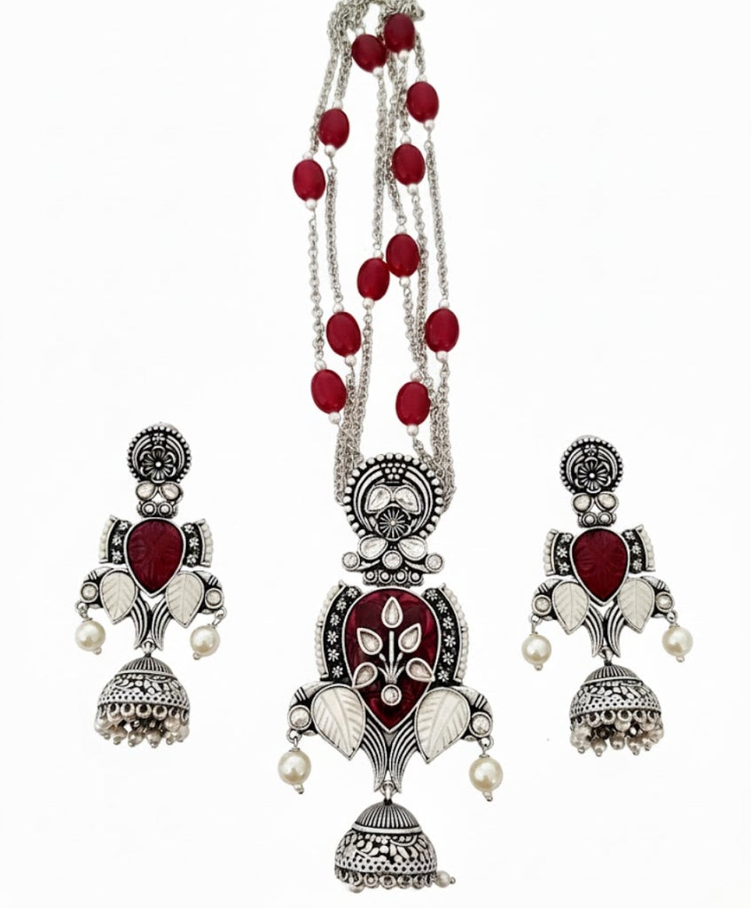 This striking jewelry set features a multi-strand beaded chain leading to a large, artistic pendant designed with tribal leaf motifs and a bold oxidized silver finish. The centerpiece is accented with vibrant, carved resin stones and finished with traditional Jhumka droplets and delicate pearls. Paired with matching statement Jhumka earrings, this set blends ethnic charm with boho-chic style, making it a perfect accessory for cotton sarees and fusion wear.