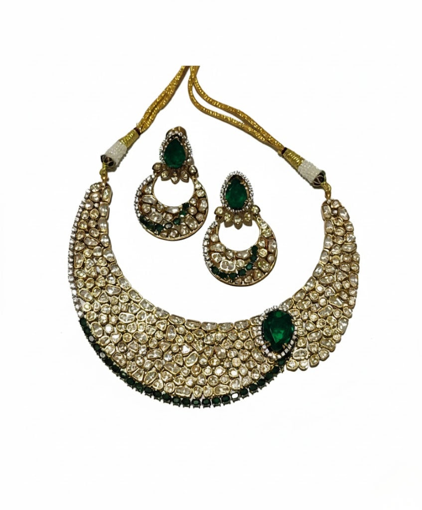 An opulent Premium Moissanite Kundan and Polki style choker set, featuring a real gold finish, embedded with sparkling clear stones and accented with a striking emerald green centerpiece and matching chandbali earrings. A classic choice for traditional attire.