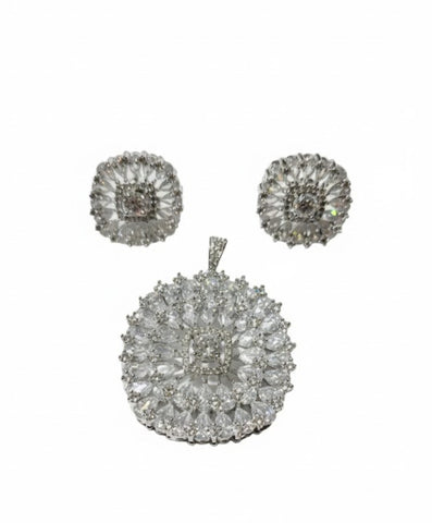 A luxurious pendant and earring duo featuring a stunning, ornate floral design. Available in brilliant Clear Diamond Simulants or vibrant Fuchsia/Ruby accents. Perfect for making a sparkling statement