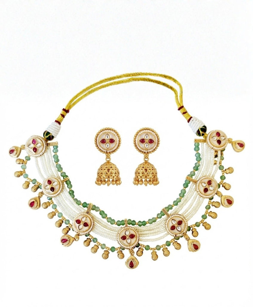 Elevate your ethnic look with this Rajwadi Kundan Pearl Choker Set, crafted with layered pearls, green beads, and intricate kundan motifs highlighted by ruby-toned accents. Paired with elegant matching jhumka earrings, this timeless set is perfect for weddings, festive occasions, and royal-inspired celebrations.