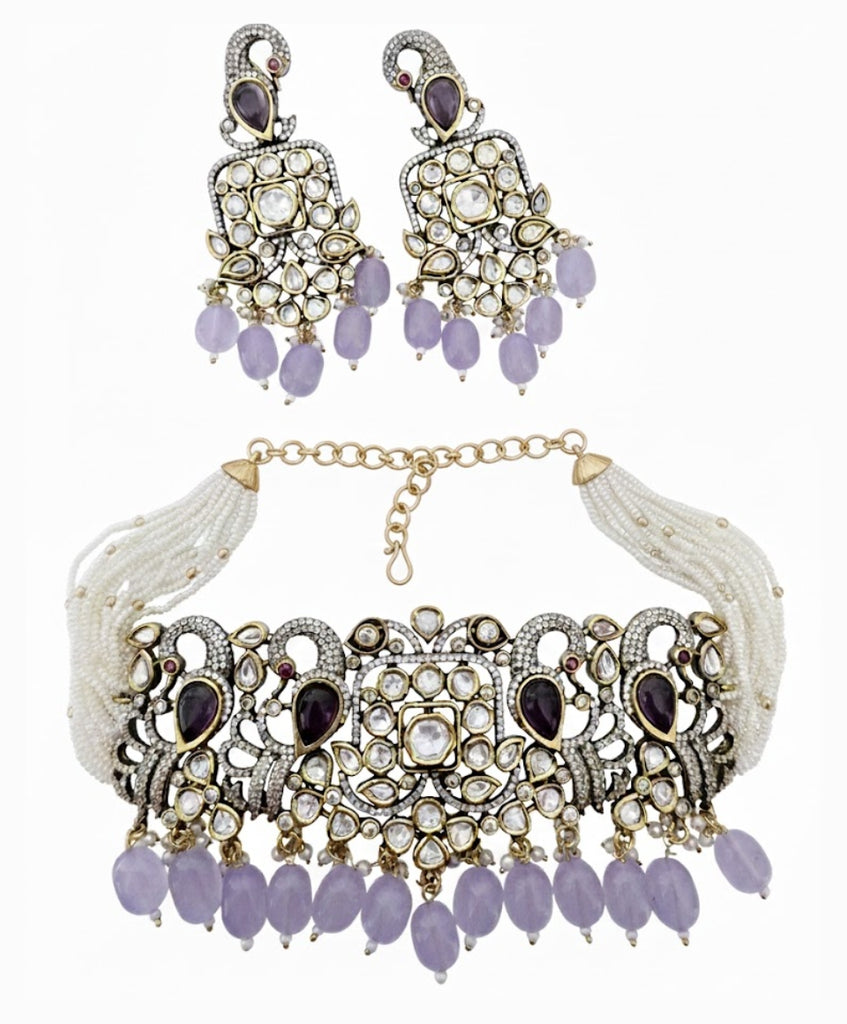 This exquisite jewelry set features a multi-strand seed pearl choker and matching statement earrings, handcrafted with intricate Kundan and Polki work. The design showcases elegant peacock motifs accented with deep purple stones and finished with a fringe of soft lavender amethyst drops. A perfect blend of heritage artistry and royal elegance, ideal for making a sophisticated statement at weddings or festive occasions.