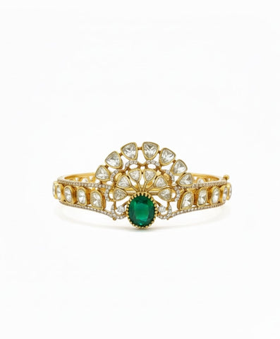 A captivating pair of gold-plated cuffs featuring radiant, pear-shaped Moissanite stones intricately set in a floral design, centered with a stunning, faceted emerald or ruby gem. These pieces blend traditional artistry with luxurious sparkle, perfect for an elevated ethnic or festive look.