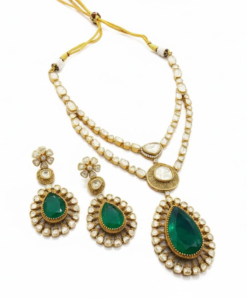 A majestic double-layered necklace and earring set featuring a stunning large teardrop-shaped green Mossinate stone pendant. The pieces are adorned with sparkling white Kundan/Mossinate stones in a detailed gold-plated setting, offering an opulent, traditional appeal.