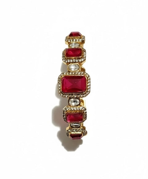 A captivating gold-toned stretch bracelet featuring bold, rectangular ruby-red stones accented by dazzling clear Kundan-style embellishments. Perfect for adding a touch of traditional elegance and color to any ensemble.