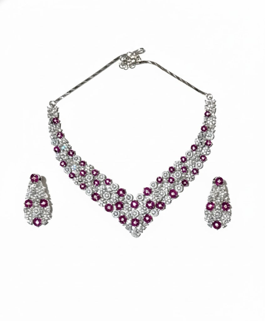 Dazzling silver-tone necklace and earring set featuring a stunning V-line silhouette. Adorned with brilliant-cut, vibrant pink/ruby and clear cubic zirconia stones for maximum sparkle. Perfect for glamourous parties, evening wear, and Western formal events.