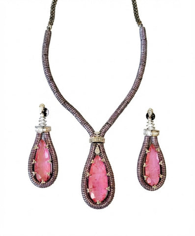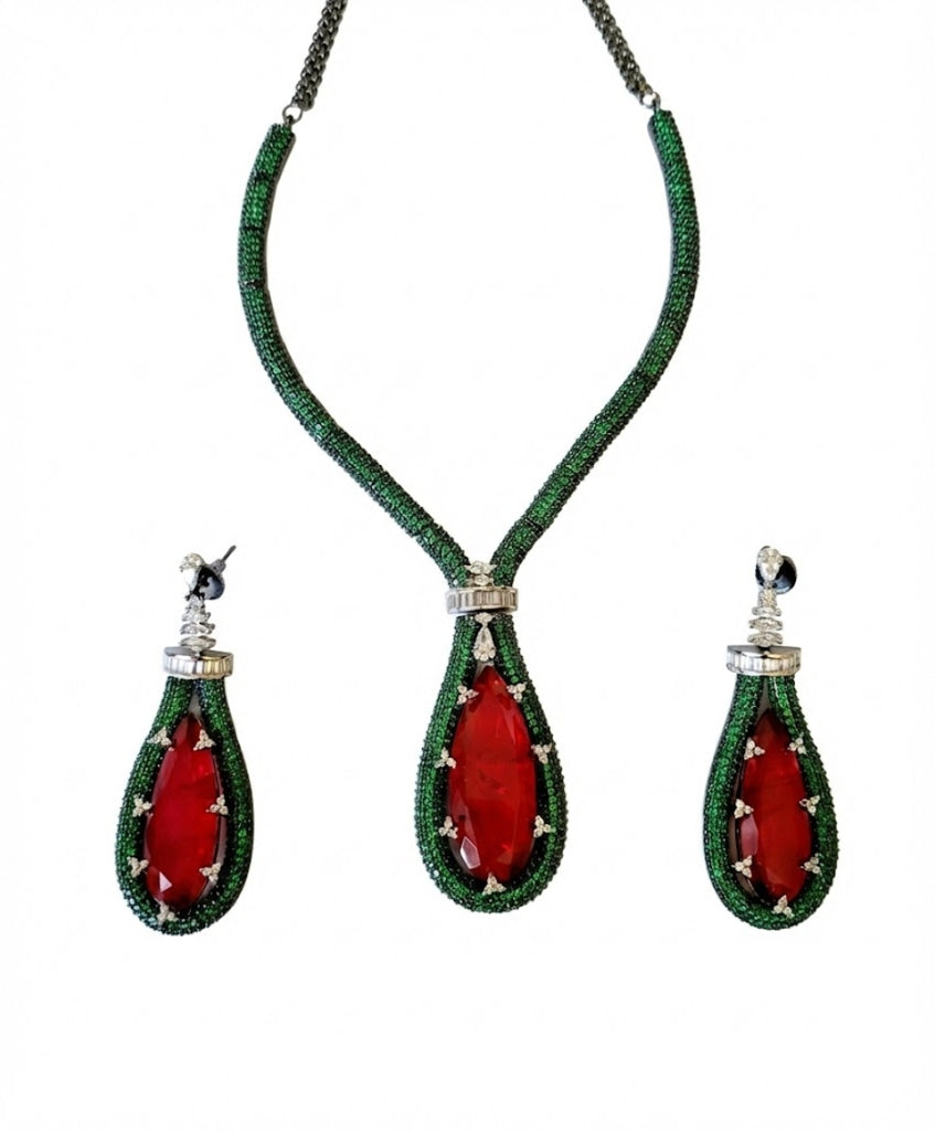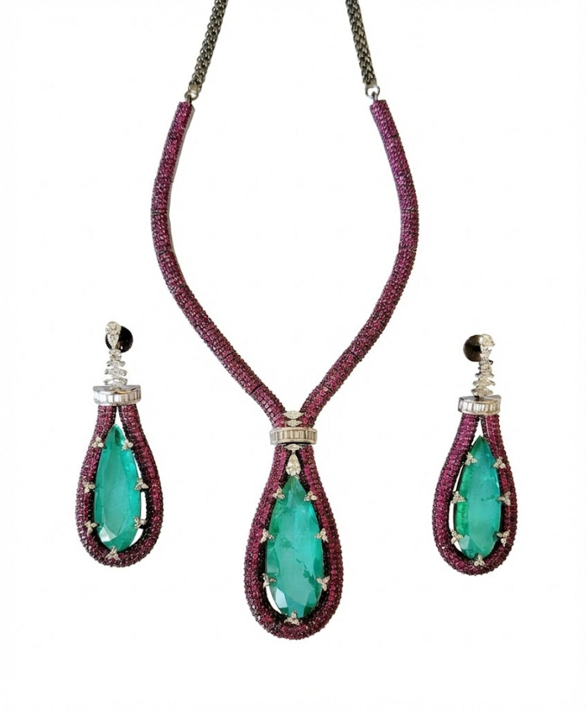 A premium necklace and earring set featuring elegant teardrop-shaped stones with intricate detailing and a refined finish. Designed to offer a timeless, luxurious look, this statement set is perfect for weddings, festive occasions, and evening wear.