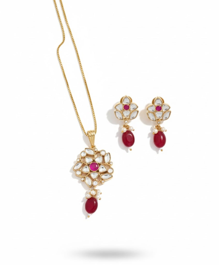 An elegant and minimalist gold-tone pendant and earring set featuring a stunning floral motif. Each piece is intricately designed with shimmering Polki-style uncut stones and a central bright Ruby cabochon. The look is completed by a graceful teardrop ruby and faux pearl drop. The pendant hangs from a fine chain, making this set perfect for daily wear or understated festive elegance.