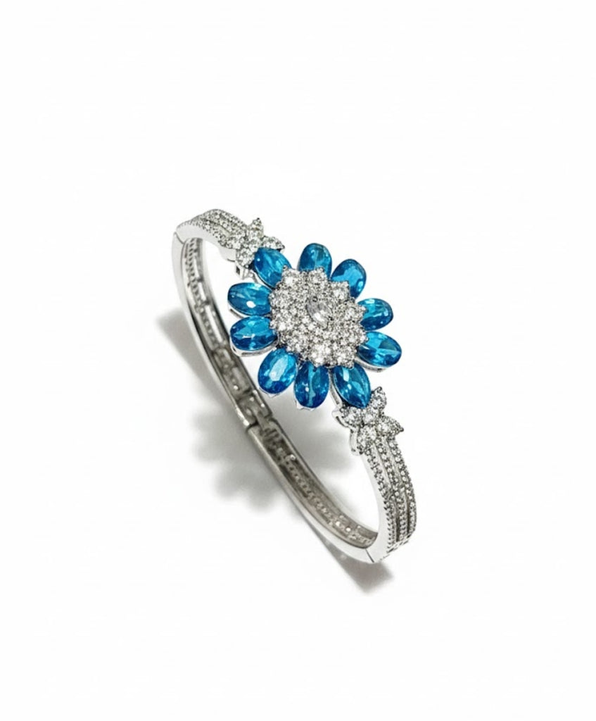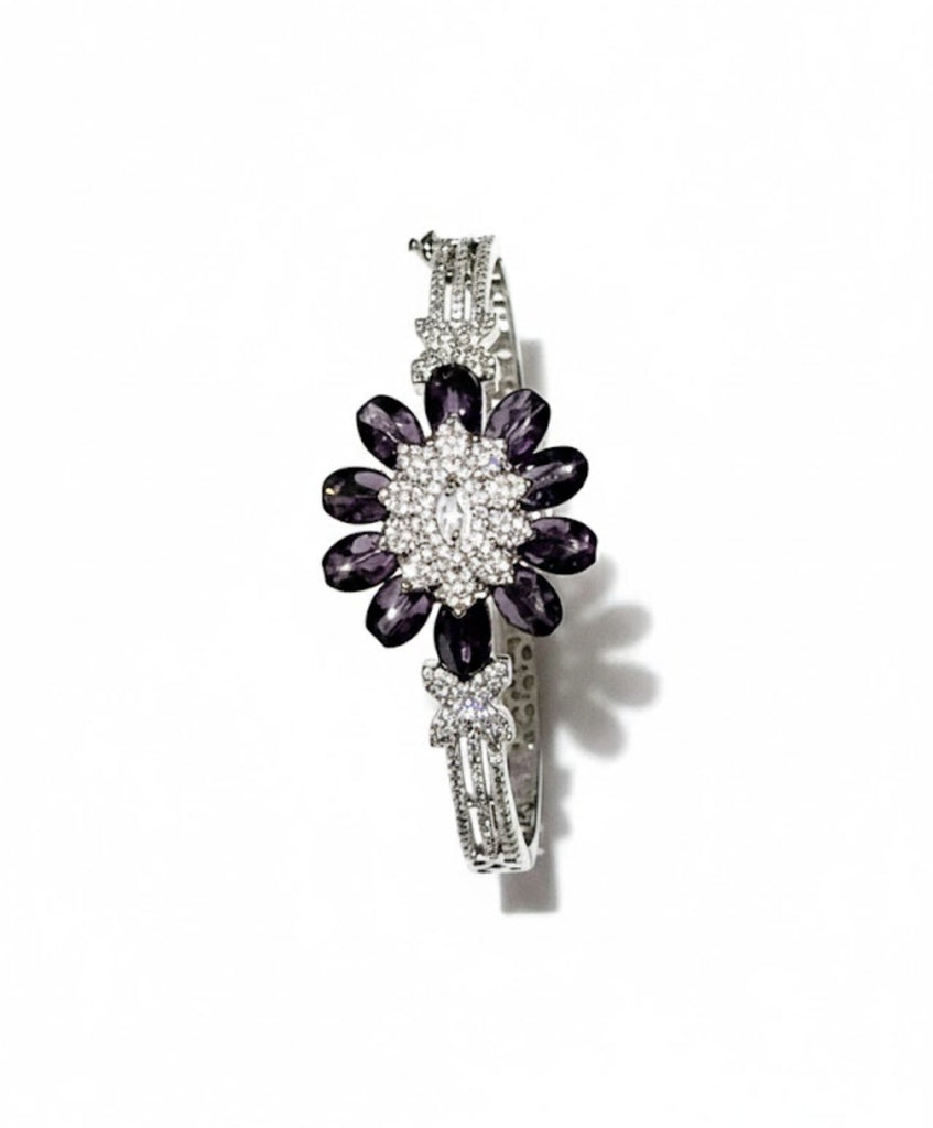 An elegant bangle bracelet featuring a central flower cluster of brilliant gemstones, beautifully accented with dazzling, paved simulated diamonds. A perfect piece for adding a touch of floral glamour.