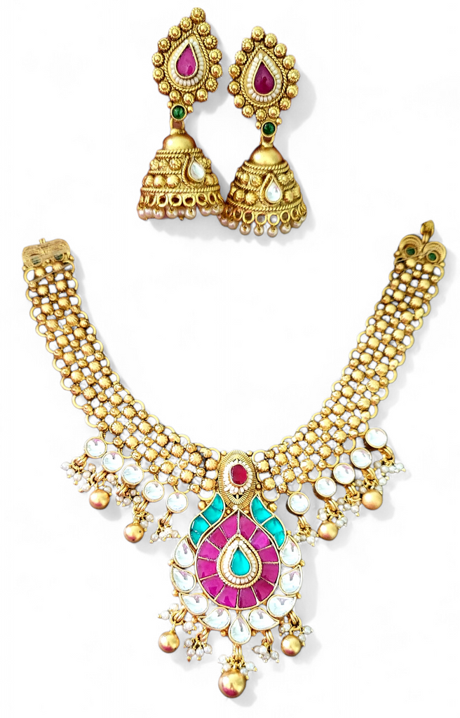 Kundan necklace in rajwadi style with gold beads in gold polish and comes with earrings set.