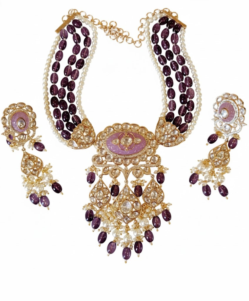 Radiate regal charm with this luxurious multi-strand choker set, featuring four rows of lustrous deep purple amethyst beads accented by delicate white seed pearls. The center is anchored by a magnificent hand-carved lavender stone pendant, surrounded by intricate gold-toned Polki work and finished with a waterfall of matching bead droplets. Complete with ornate statement earrings, this set is the ultimate accessory for high-fashion weddings and grand celebrations.