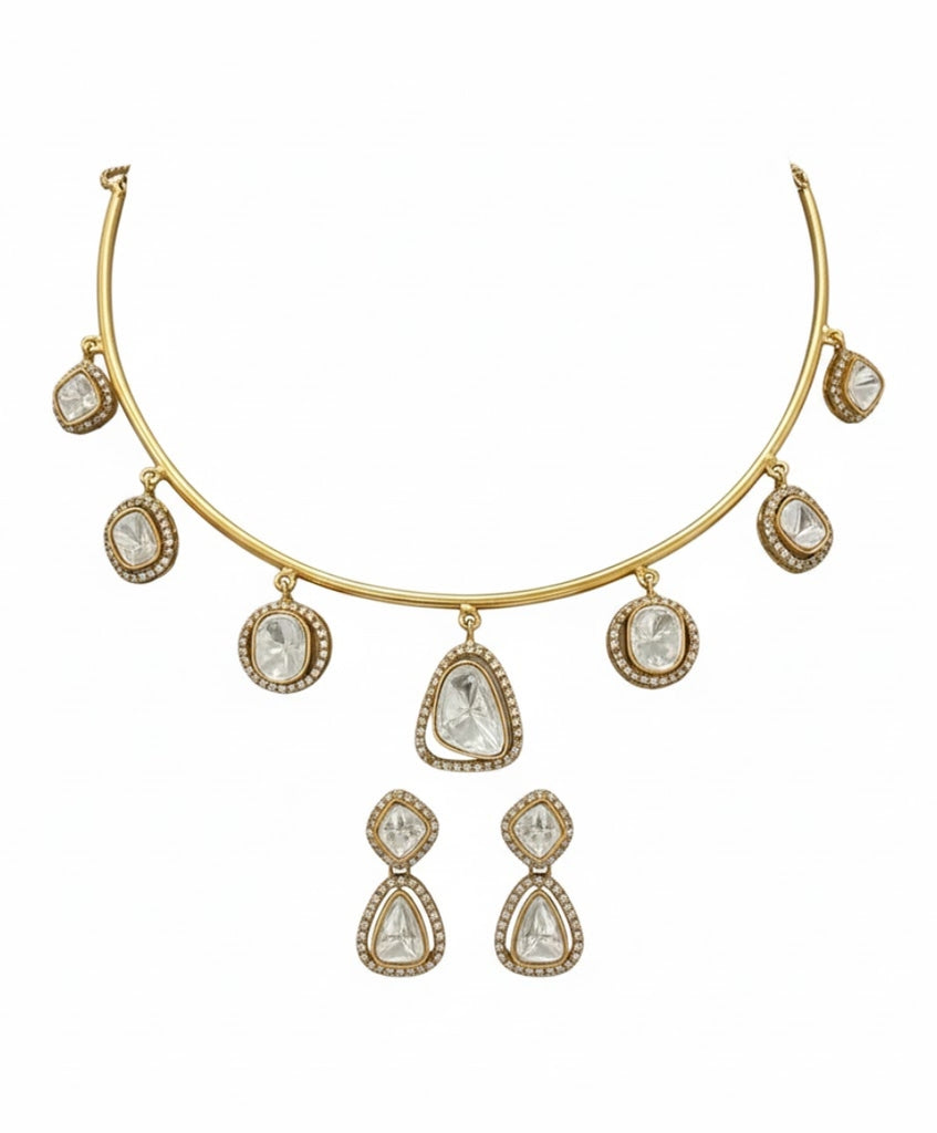 A stunning gold-tone choker and earring set featuring beautifully clustered Polki (uncut diamond) stones set in ornate, halo-style pendants. The modern wire necklace design with dangling droplet and cushion-cut motifs perfectly merges contemporary elegance with traditional Indian heritage, making it a versatile statement piece.