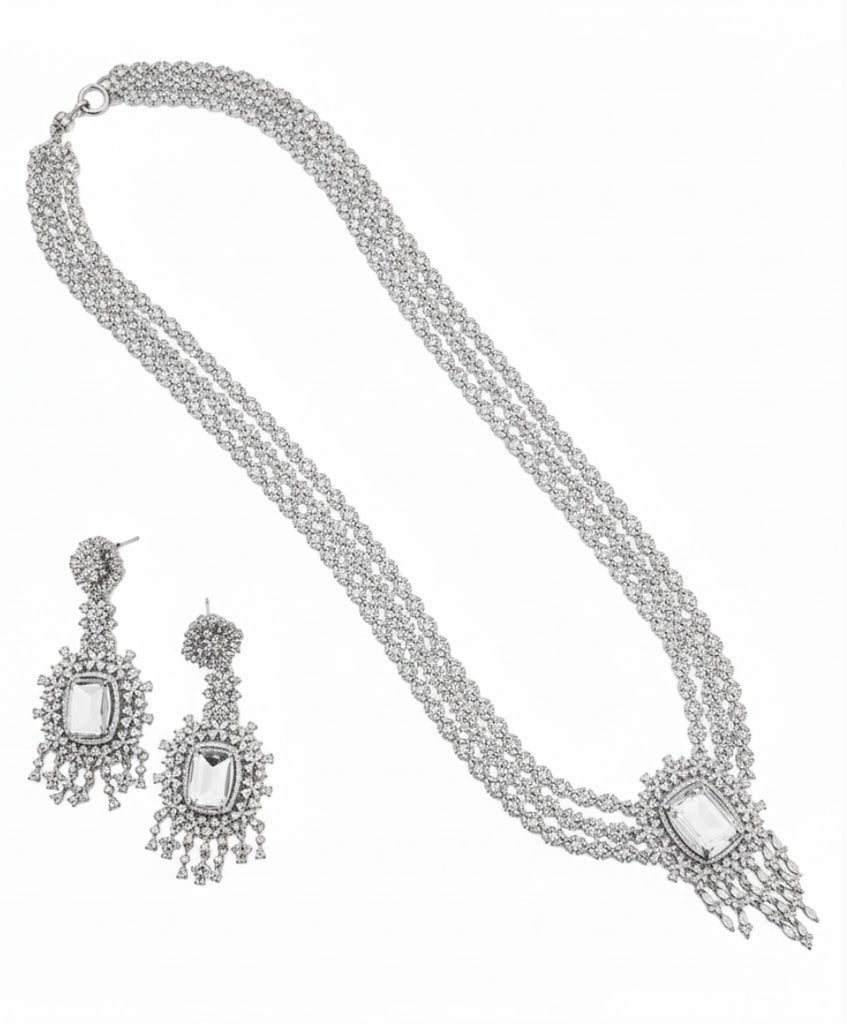 The set features a triple-strand layered necklace and matching chandelier earrings, all heavily embellished with high-quality, brilliant-cut crystals. The centerpiece of both the necklace and earrings is a majestic, emerald-cut solitaire, surrounded by a delicate halo of shimmering stones that capture and reflect light from every angle.