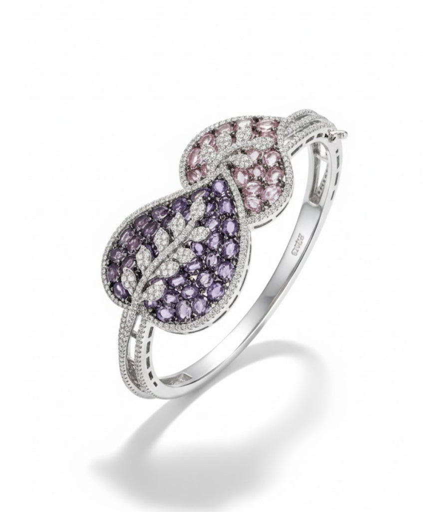 A romantic and distinctive cuff bracelet featuring two overlapping, heart-shaped leaf motifs. The design is richly adorned with dazzling white stones and a mix of soft pink and deep purple (Amethyst) oval-cut gemstones, emphasizing its unique dual-tone appeal.