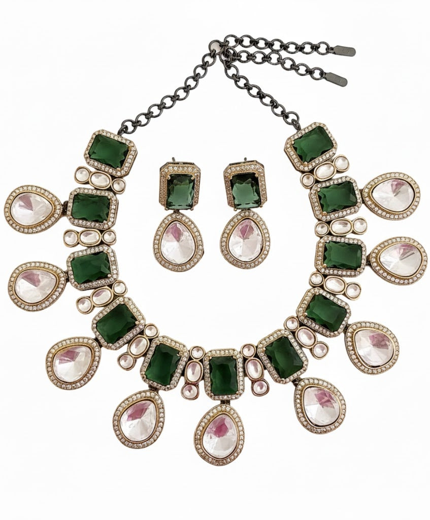 Make a bold style statement with this breathtaking contemporary Polki necklace and earring set. It features a striking combination of deep emerald-green rectangular stones and oversized pear-cut Polki crystals, all meticulously framed with a shimmering micro-crystal border. Designed for the modern woman who loves a touch of vintage glamour, this set’s rhythmic arrangement and high-contrast palette make it an ideal centerpiece for evening gowns or luxury sarees.