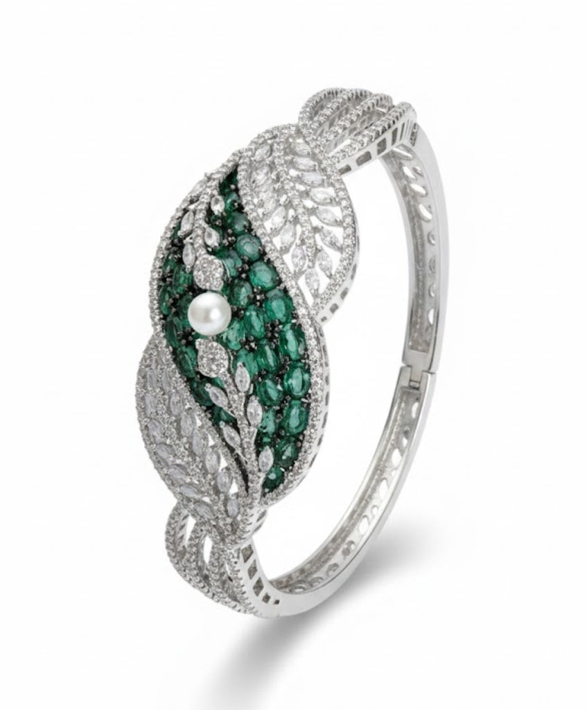 A captivating statement cuff bracelet featuring a sweeping leaf or vine design. It is richly embellished with brilliant white stones and a bold central band of oval-cut Emerald (or green) gemstones, accented by a single luminous pearl. A blend of nature-inspired beauty and luxury.