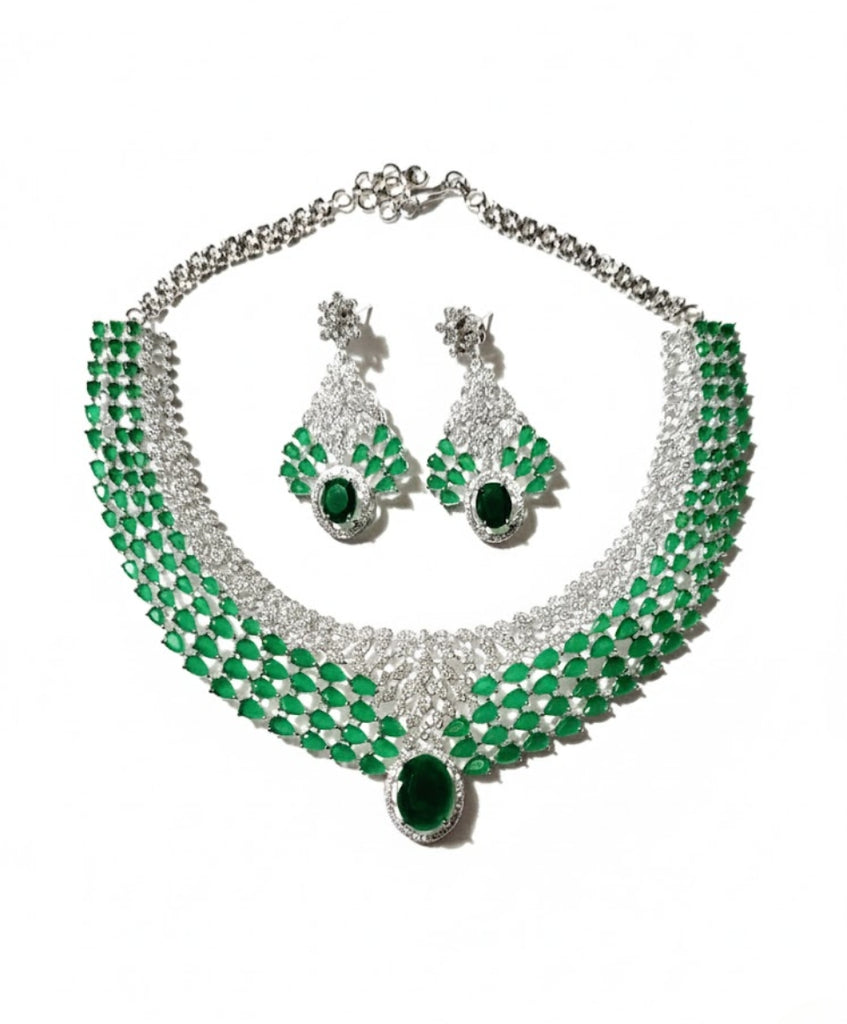 Command attention with this breathtaking set, where regal emerald-green stones meet brilliant silver-toned cubic zirconia. This sophisticated choker necklace features a dazzling cascade of meticulously set stones, crowned by a prominent central emerald pendant. The matching fan-design drop earrings complete the look, making this the perfect statement piece for weddings, grand galas, and any occasion requiring unforgettable glamour.
