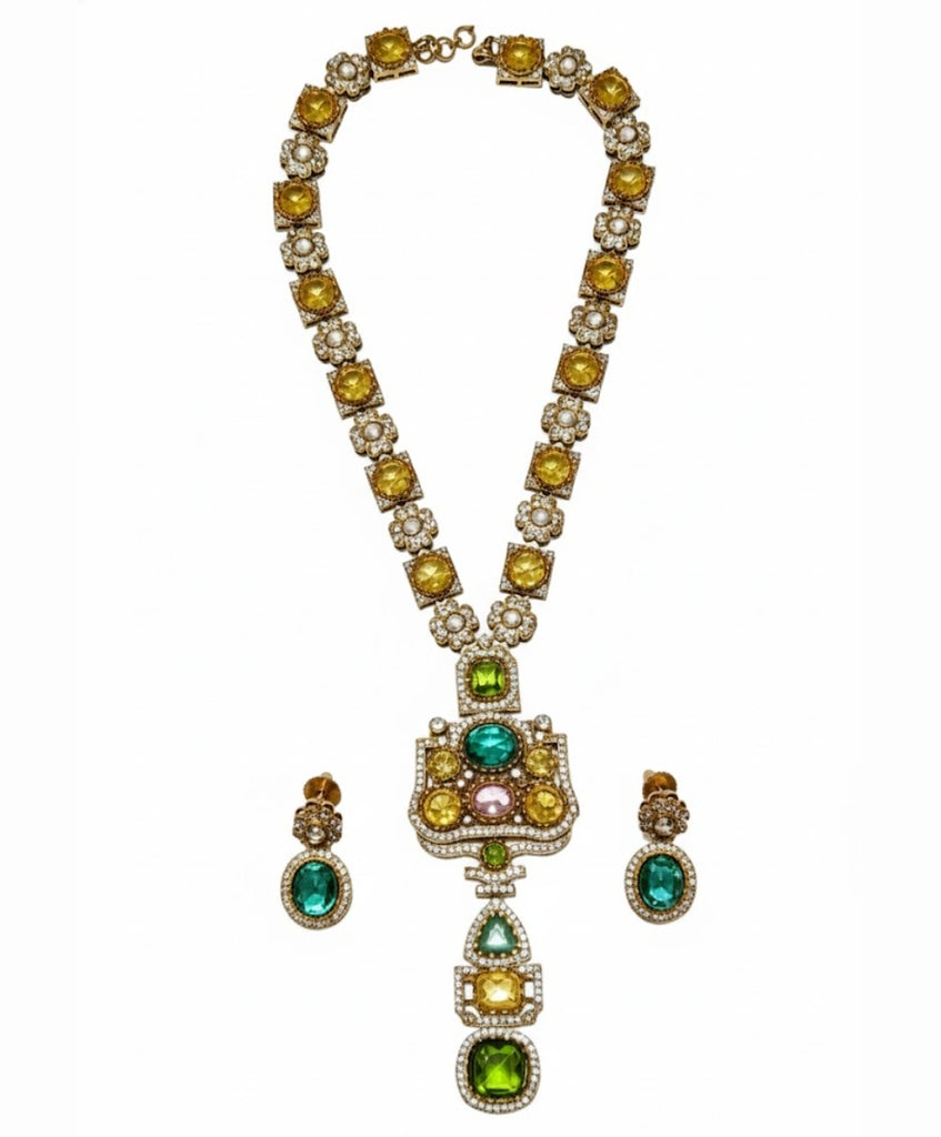 Radiate royal charm with this magnificent gold-finished long necklace set, featuring a stunning array of sun-kissed citrine-toned stones. The piece is masterfully designed with a sequence of square and floral-cut yellow gems, leading to a majestic geometric pendant adorned with vibrant emerald and blush-pink accents. Every stone is meticulously framed by a shimmering crystal border, creating a rich, multi-dimensional sparkle. Paired with matching emerald-drop earrings, this exquisite set is a perfect blend of traditional grandeur and colorful sophistication for weddings and high-profile celebrations.