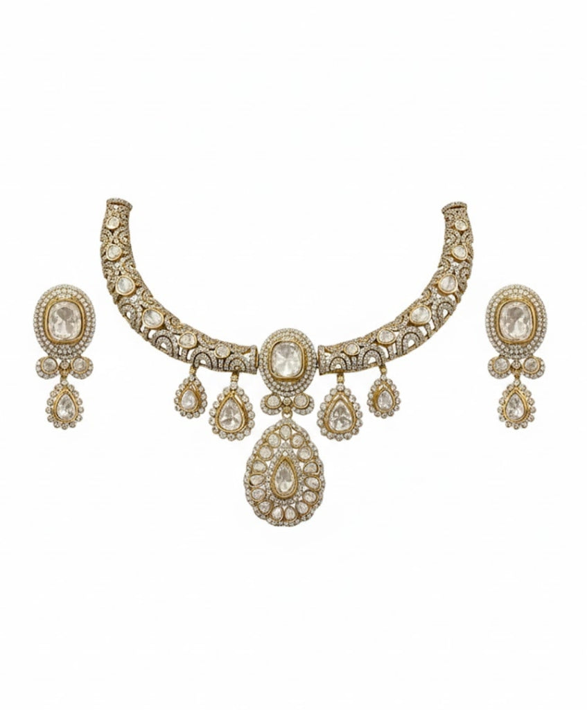 An exquisite Polki diamond and pearl necklace and earring set, featuring an ornate choker-style collar and coordinating ear pendants. The design is characterized by its mughal-inspired setting, with large central stones surrounded by smaller accents, culminating in elegant tear-drop motifs. This set embodies royal elegance and timeless Indian craftsmanship.