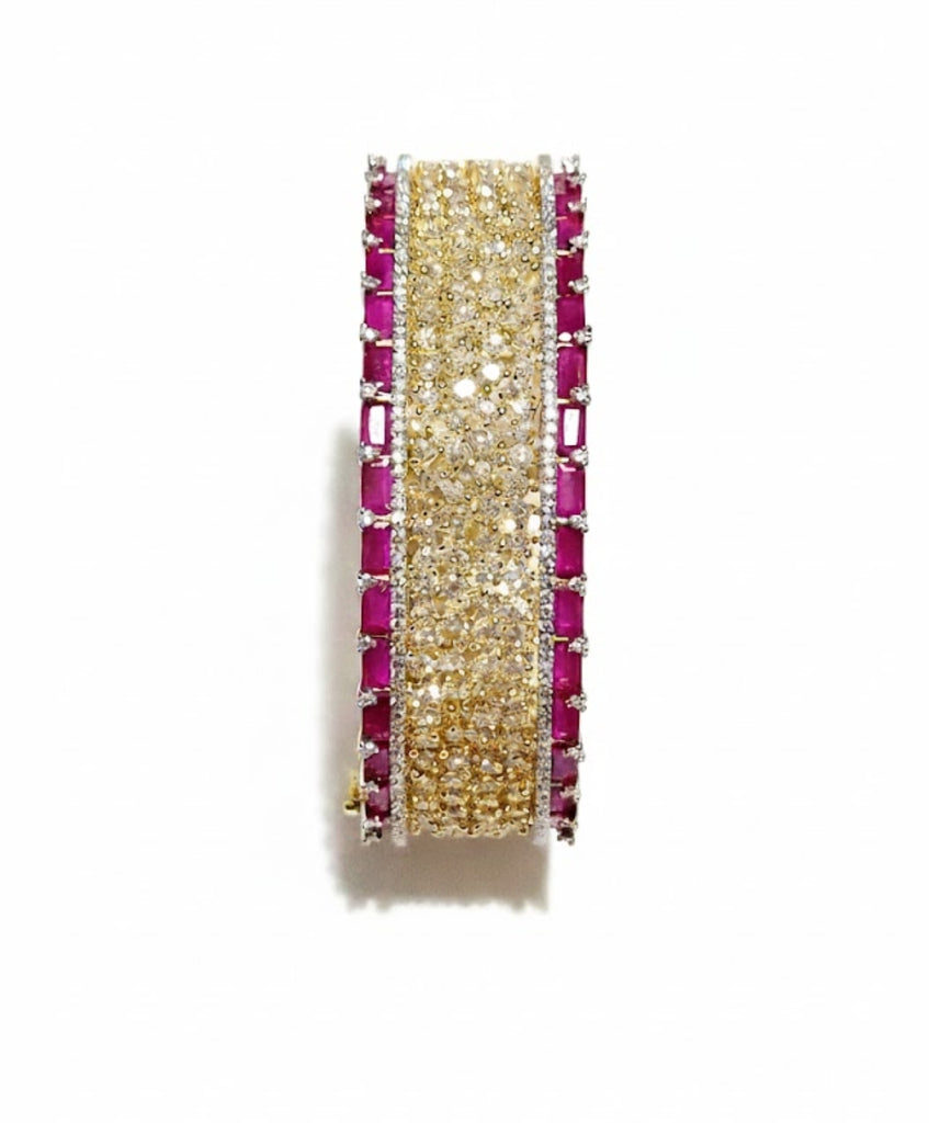 This opulent cuff bangle is designed to capture all the light in the room. It features a wide band meticulously paved with brilliant-cut, high-quality cubic zirconia (CZ) stones, creating a magnificent field of golden-hued sparkle
