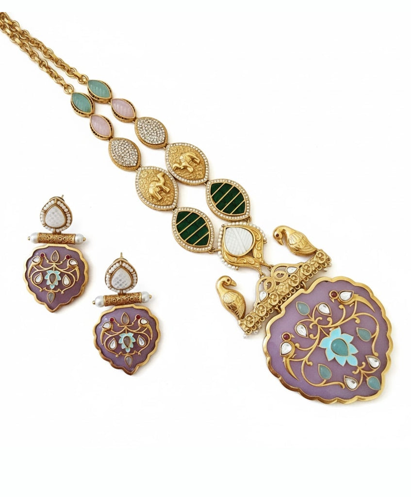 A masterpiece of ethnic storytelling, this long-form necklace and earring set features a stunning fusion of traditional motifs and soft pastel tones. The necklace showcases a sequence of oval links depicting golden elephants, sparkling crystals, and vibrant green stripes, leading to a majestic lavender Meenakari pendant adorned with intricate floral and bird patterns. Complete with matching drop earrings, this artisanal set captures the grandeur of royal heritage with a unique, contemporary color palette