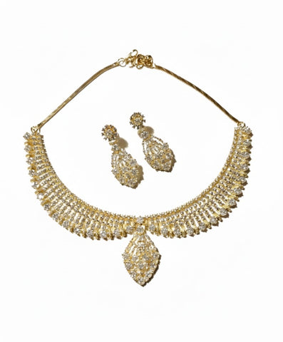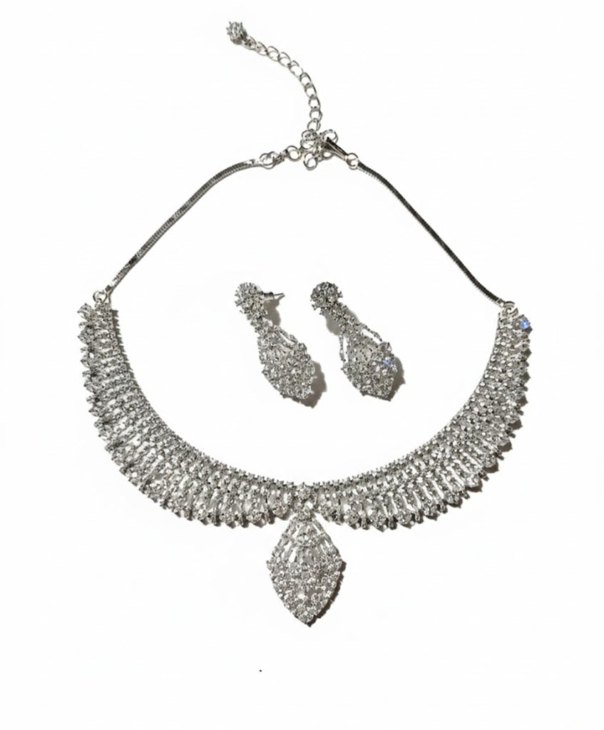 Embrace timeless elegance with The Lumina Drop Necklace Set. This sophisticated design features a slender, curve-hugging necklace adorned with rows of glittering cubic zirconia stones, culminating in a dazzling, oversized teardrop pendant. Complete with matching delicate drop earrings, this set is perfect for adding a touch of understated glamour and sparkle to any formal or semi-formal event.