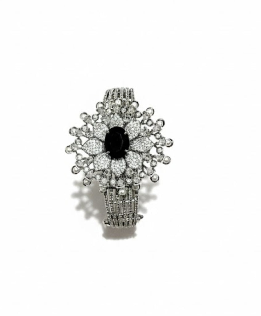 A captivating sterling silver cuff bracelet featuring a dazzling floral centerpiece. It showcases a deep, central black gemstone (onyx or similar) surrounded by a brilliant halo of micro-set cubic zirconia stones, accented with delicate faux pearls resembling dewdrops. The multi-row, finely textured band adds sophisticated sparkle, making it a luxurious statement piece perfect for evening wear and grand occasions.