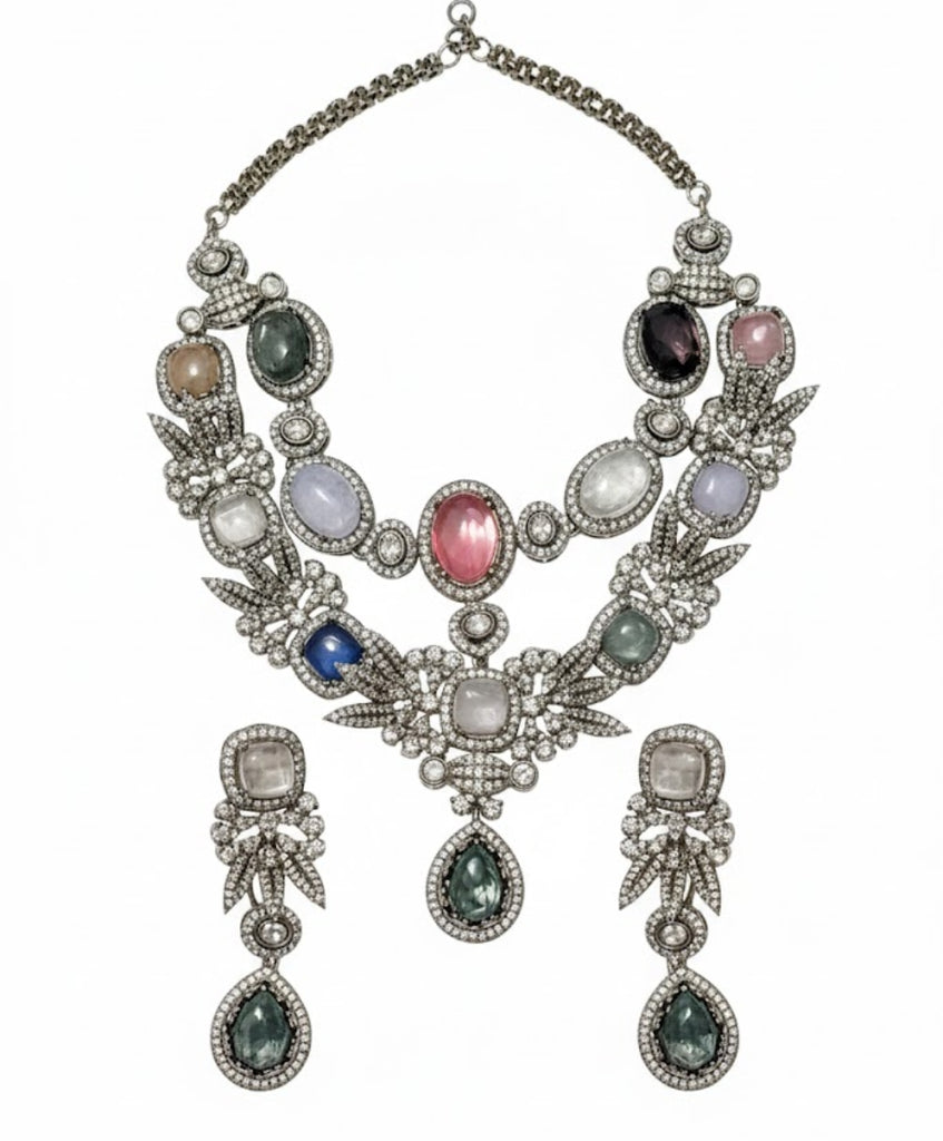 Celebrate the spectrum of elegance with the Navratna Aura Set, a sophisticated jewelry ensemble that marries traditional inspiration with contemporary luxury. This set is designed for the modern woman who seeks a versatile yet grand accessory for high-profile celebrations.