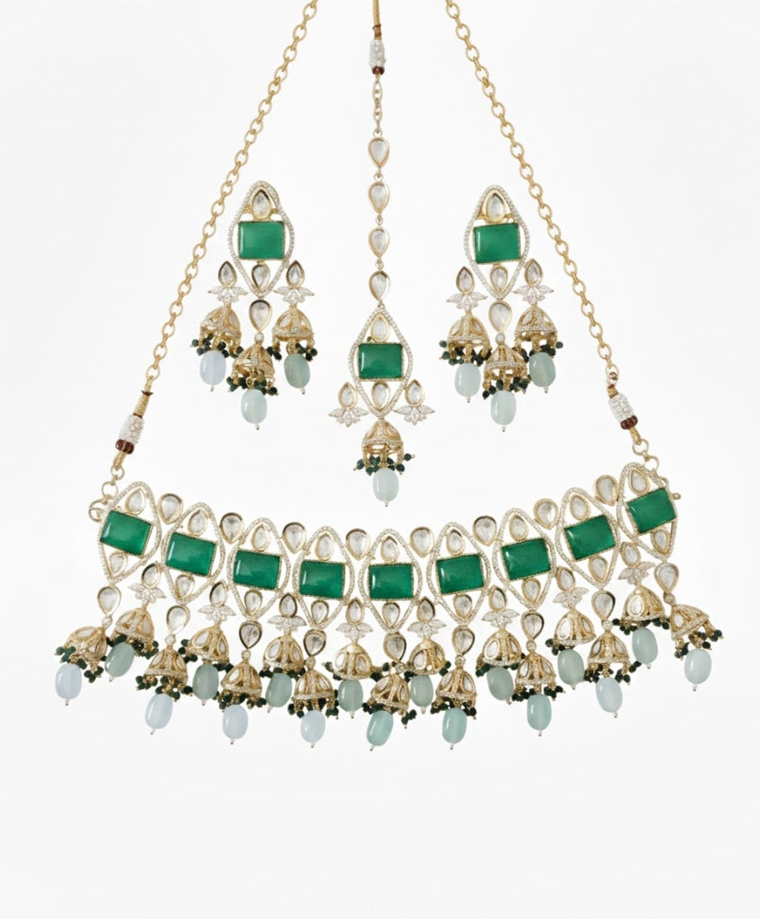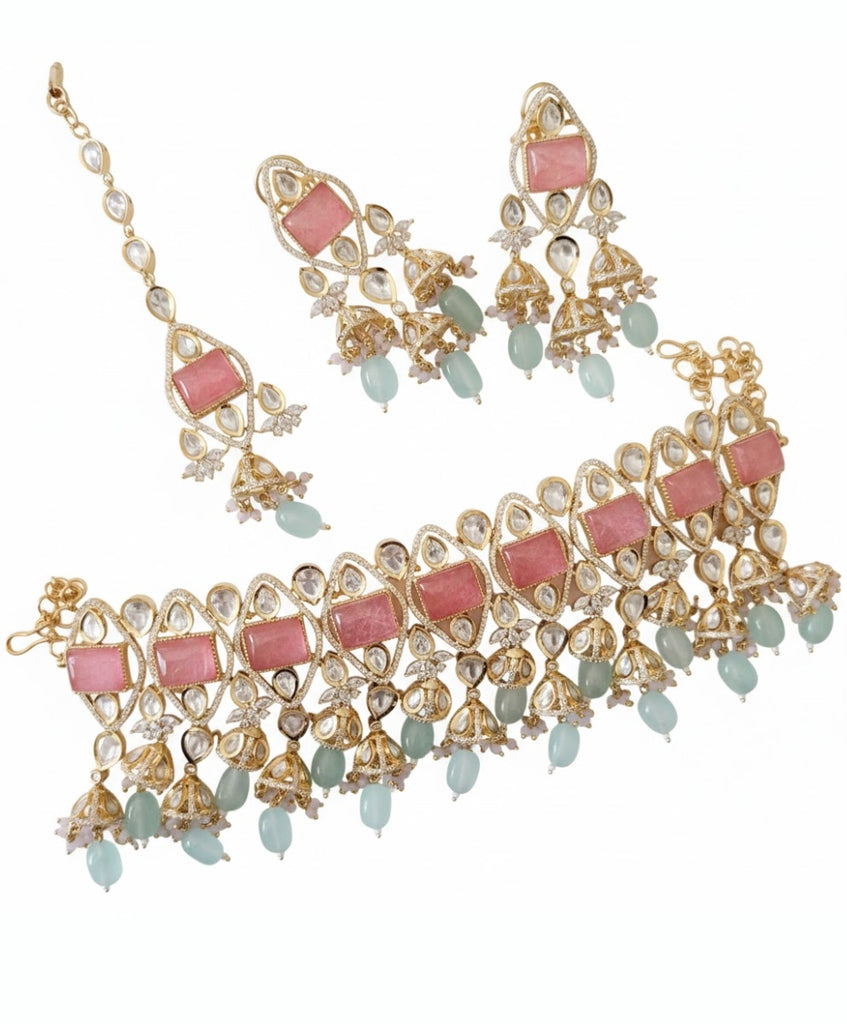 Embrace soft elegance with this exquisite Kundan choker set, featuring rectangular dusty pink stones framed by shimmering crystals. This handcrafted masterpiece is beautifully finished with delicate gold jhumka drops and refreshing mint green beads, creating a perfect harmony of colors. Complete with matching long earrings and a graceful Maang Tikka, this set is an ideal choice for a sophisticated daytime wedding or a festive celebration.