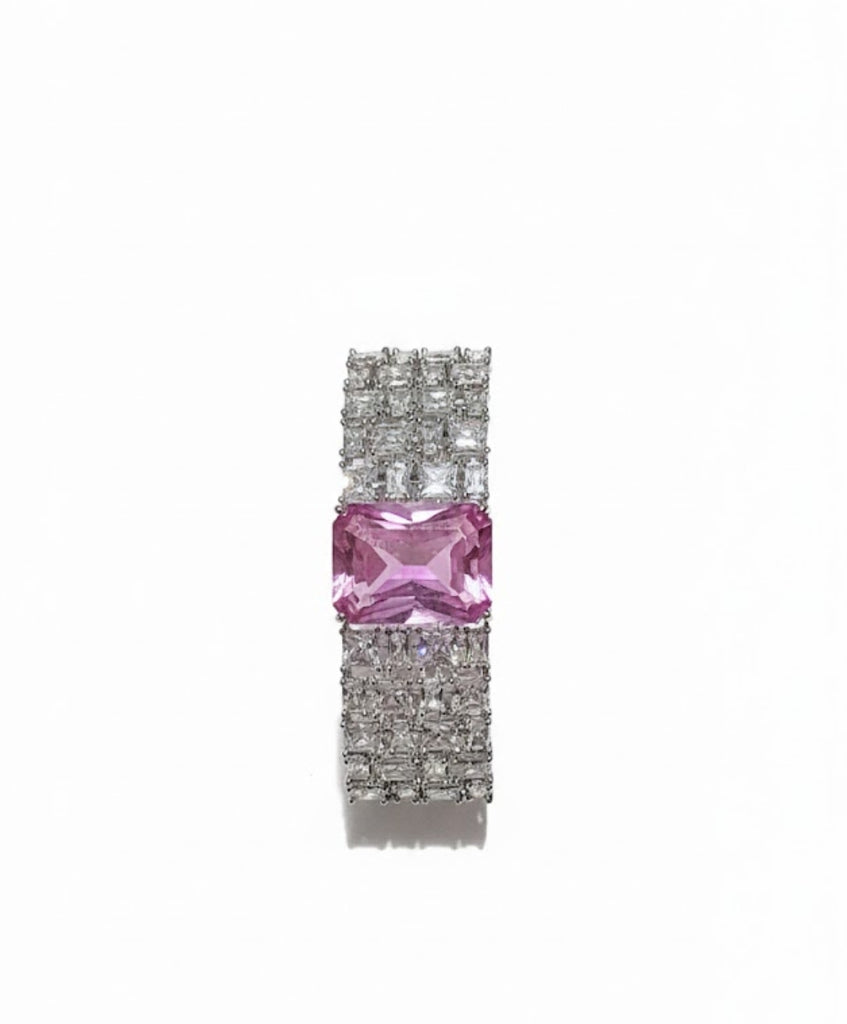 A luxurious, wide cuff bracelet centered with a striking emerald-cut gemstone (available in both vibrant Pink and deep Emerald Green). The band is richly embellished with three rows of dazzling Princess-cut simulated diamonds for a bold, opulent look.