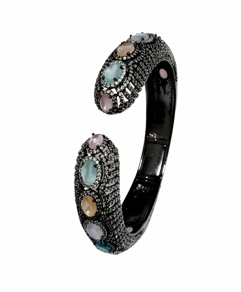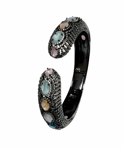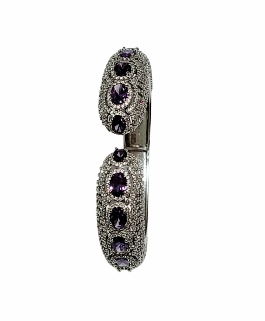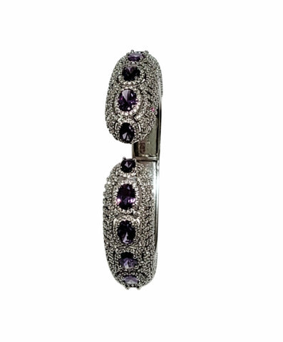 An opulent, hinge-opening cuff bracelet designed to make a commanding statement. It features a bold, wide band fully paved with brilliant micro-set stones, providing exceptional texture and shimmer. The centerpiece of the cuff is adorned with large, bezel-set oval gemstones, creating a luxurious and colorful focal point. This piece combines classic structure with lavish detailing, perfect for elevating any formal or celebratory ensemble.